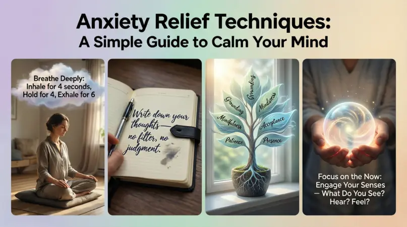 Anxiety relief techniques are simple actions you can use to calm your mind and body. They help you feel safe, focused, and more in control. The good news is that you do not need special tools or expensive programs. Many techniques are easy, free, and can be practiced anywhere.