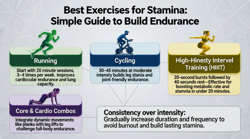 The best exercises for stamina are physical activities that train your heart, lungs, and muscles to work longer without getting tired. These exercises focus on improving endurance rather than just strength or size. Stamina exercises help your body use oxygen more efficiently and manage energy better during activity.