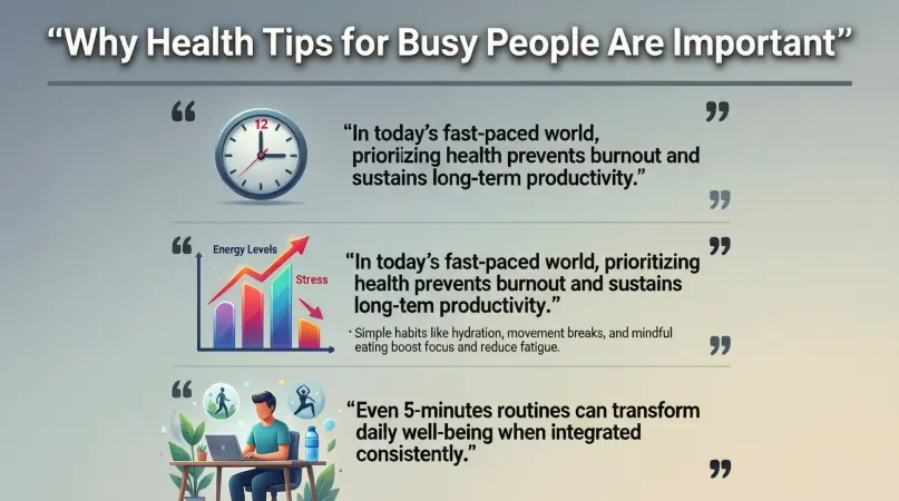 Health tips for busy people are simple and time-saving practices that support physical and mental well-being. They are designed for people who have limited time but still want to live a healthy life. These tips focus on smart choices instead of complex routines.